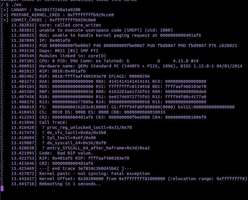 이 상태에서 기존 ex 바이너리를 실행시키면 커널 패닉이 발생한다. smep가 걸려 있는 상태에서 커널 모드에서 유저 영역의 코드를 수행하려고 하였기 때문이다.