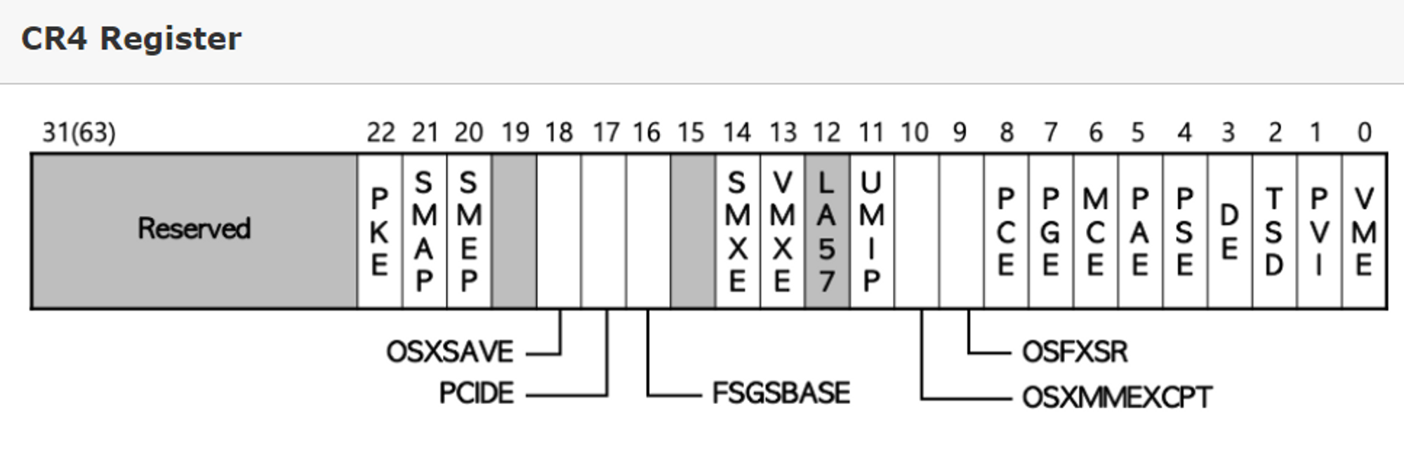 특히 CR4레지스터는 프로세스에서 지원하는 각종 확장 기능들을 제어하는 역할을 맡고 있고, SMEP와 SMAP도 여기에 포한됨다. CR4에서 SMEP는 20번째 비트, SMAP는 21번째 비트이다.