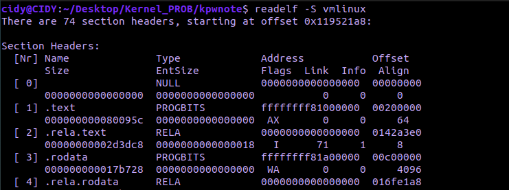 base주소를 구해야 한다면 .text영역과의 차이를 구하면 된다. 일반 바이너리와 동일하게 vmlinux바이너리를 대상으로 그냥 readelf하면 섹션 offset을 알 수 있다.